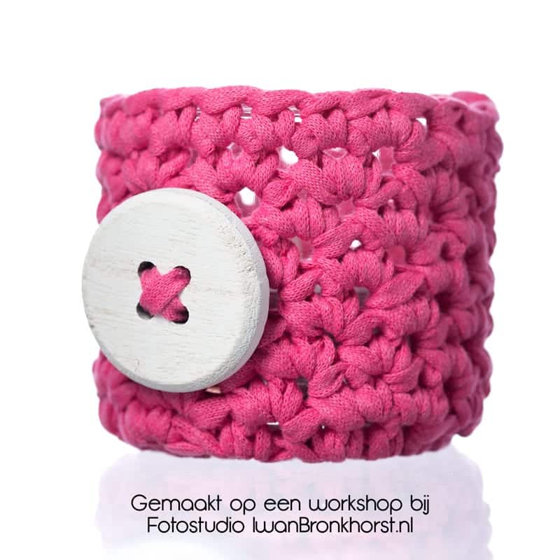 Tijdens het eerste deel van de workshop productfotografie is ingegaan op de fotocamera en instellingen, de belichting en belichtingssoorten, de do’s & dont’s, de hulpmiddelen die we in de studio gebruiken en de methodes die we hanteren bij het fotograferen en nabewerken van producten. Met dit stuk theorie als basis voor de workshop productfotografie zijn we gaan kijken naar de opbouw van de eerste fotoshoot. De cursist was vrij om te kiezen welk product we als eerste zouden gaan fotograferen en de keuze viel op een gehaakt omhulsel voor een glas met kaars.